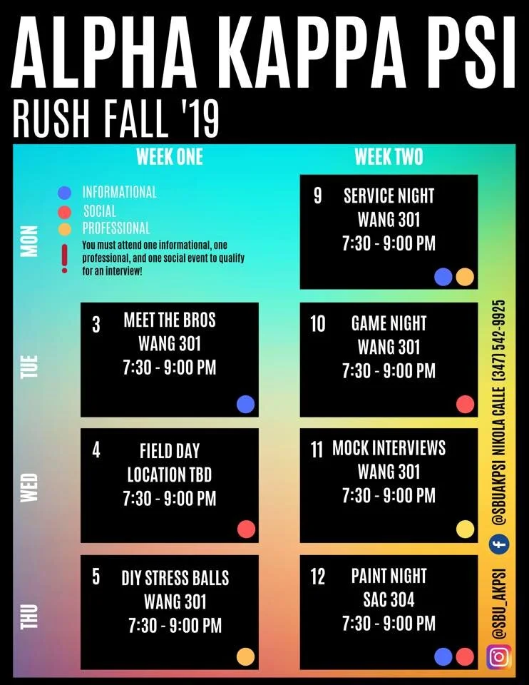 Come out to one of our informational and other rush events to learn more about how Alpha Kappa Psi can benefit you and how you can join our organization.